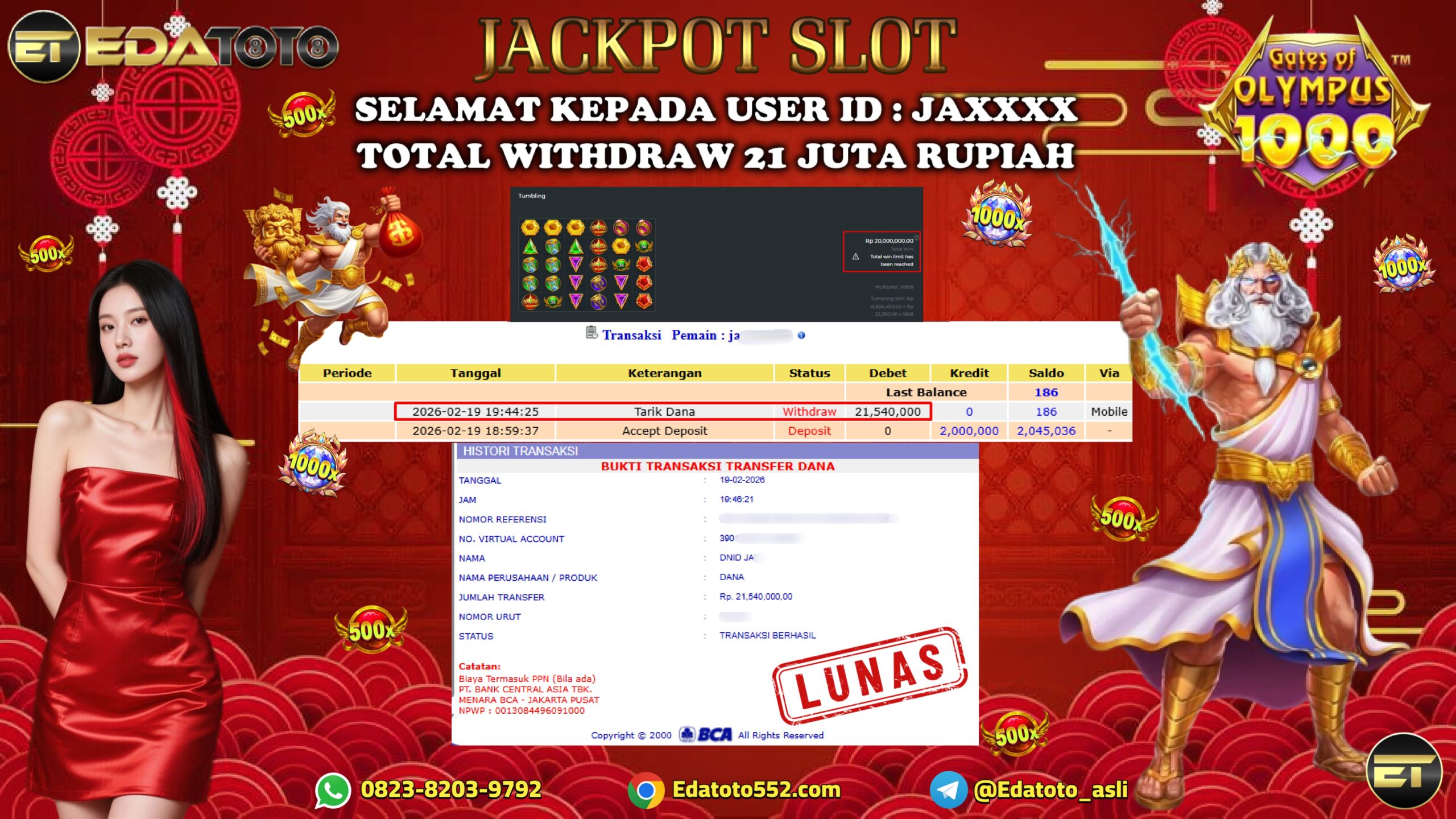 Selamat Kepada Pemilik user ID : JA**** Hari/Tanggal : Kamis / 19 februari 2026 Jackpot : Rp, 22,254,000 JT Withdraw . . .