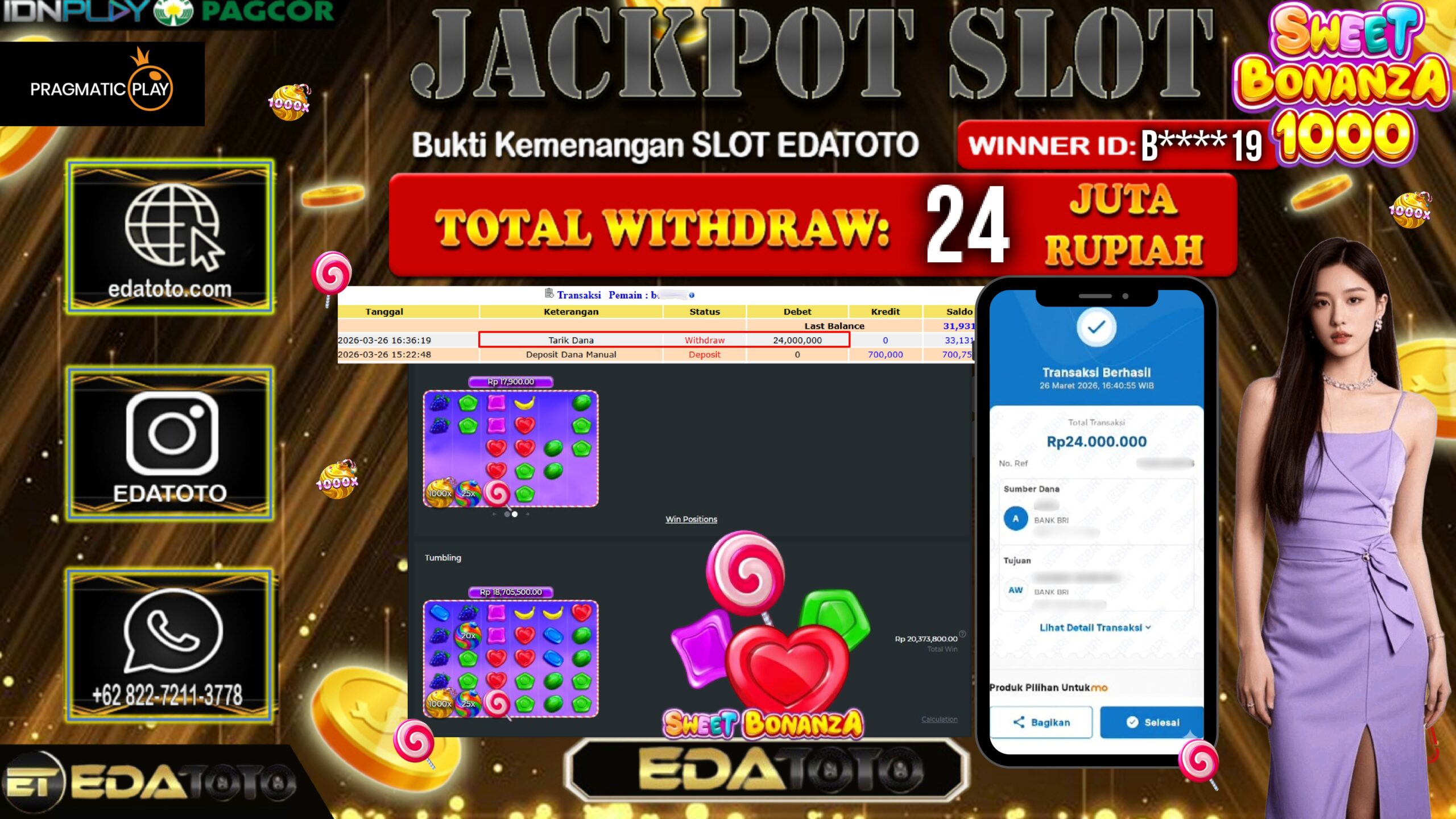 Selamat Kepada Pemilik user ID : B****19 Hari/Tanggal : Kamis / 26 MARET 2026 Jackpot : Rp, 20,373,800 JT Withdraw . . .