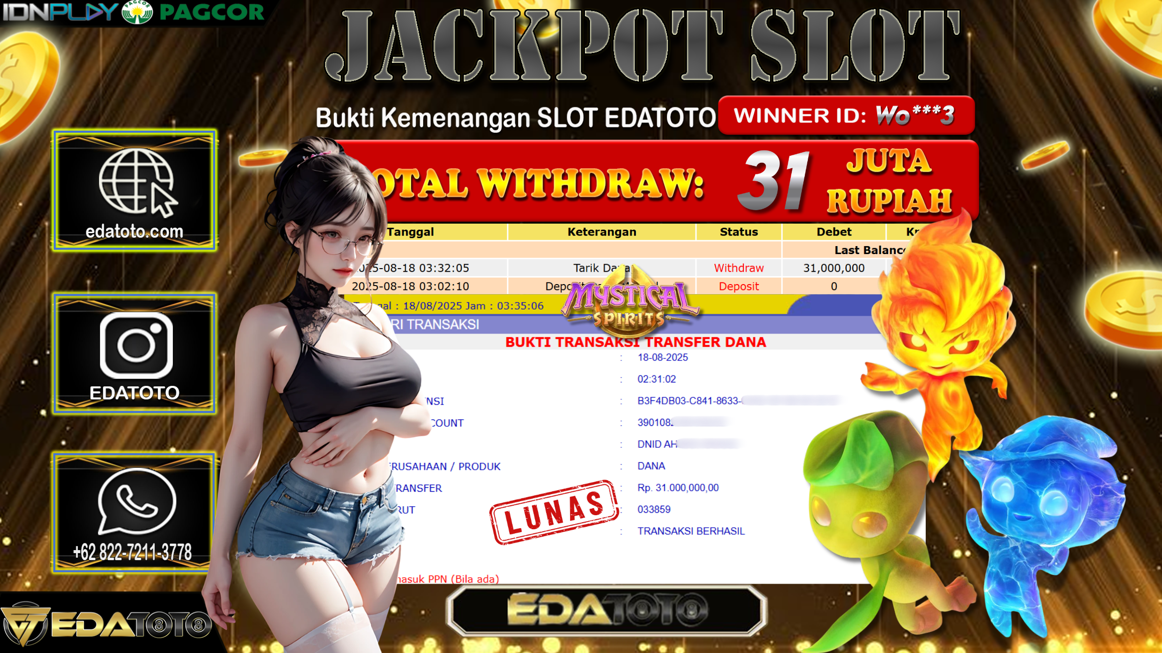 Selamat Kepada Pemilik user ID : Wo**3 Hari/Tanggal : Senin/ 18, Agustus 2025 Jackpot : Rp. 31.000.000 JT Permainan : . . .