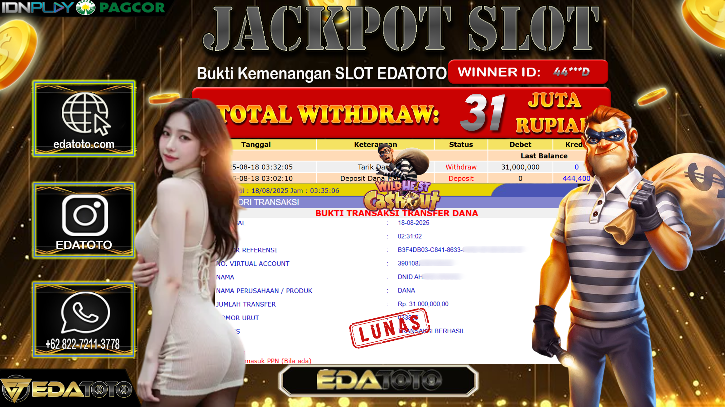 Selamat Kepada Pemilik user ID : 44***D Hari/Tanggal : Selasa/ 19, Agustus 2025 Jackpot : Rp. 31.000.000 JT Permainan : . . .